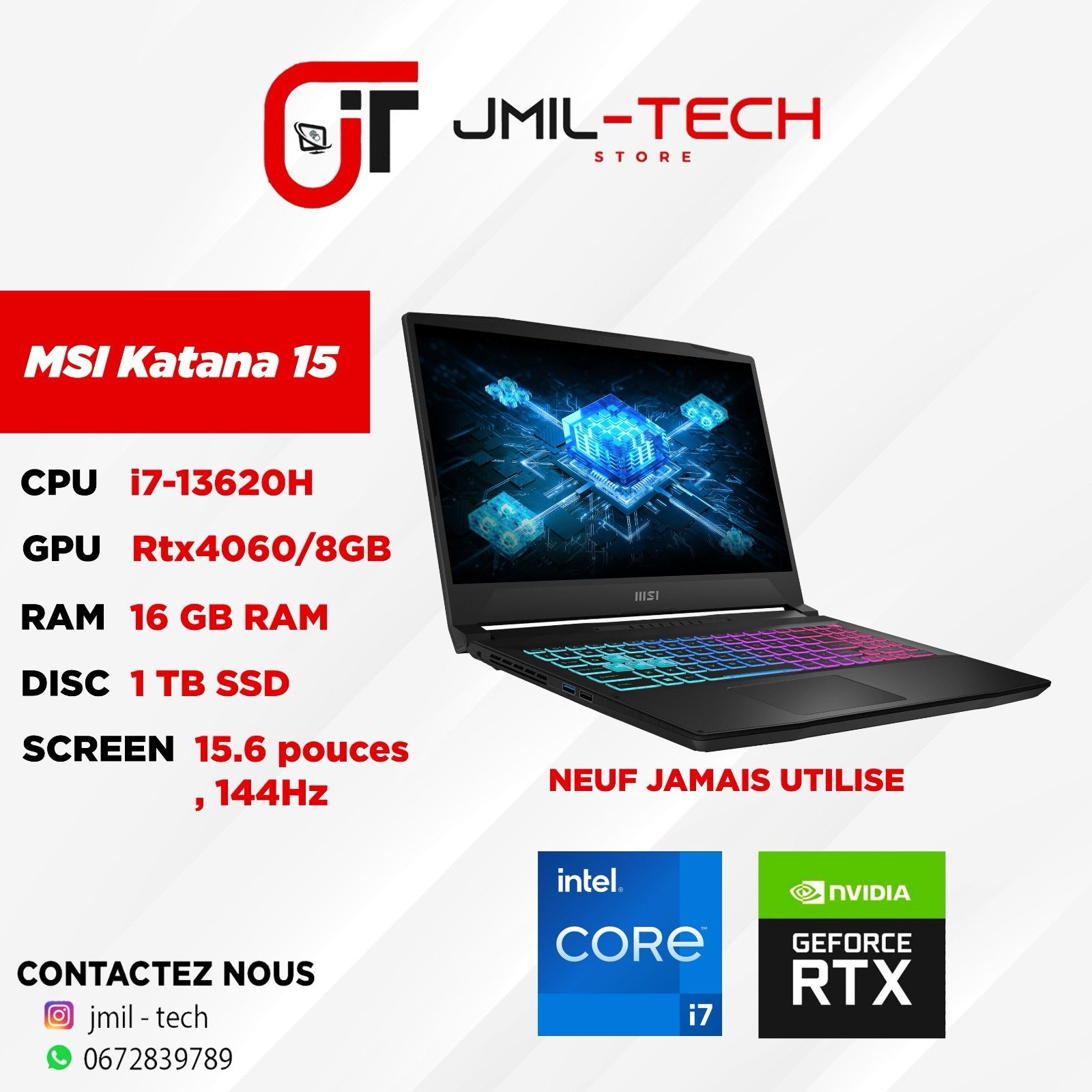 Le MSI Katana 15 disponible chez jmil-tech au Maroc, est un PC portable gaming puissant avec processeur Intel Core i7-13620H, carte graphique NVIDIA RTX 4060 et écran 144Hz.